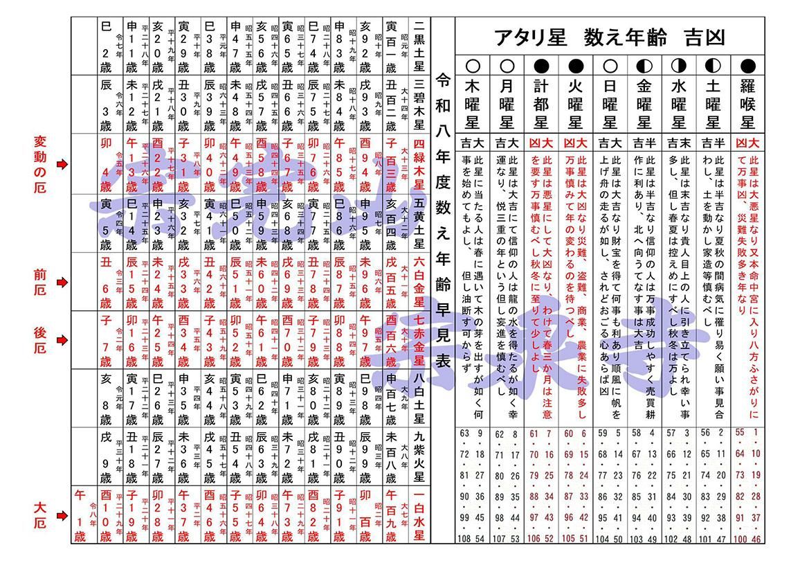高野山 宗泉寺 白黒吉凶表 来年の運勢は?厄年? 自分の九星は?